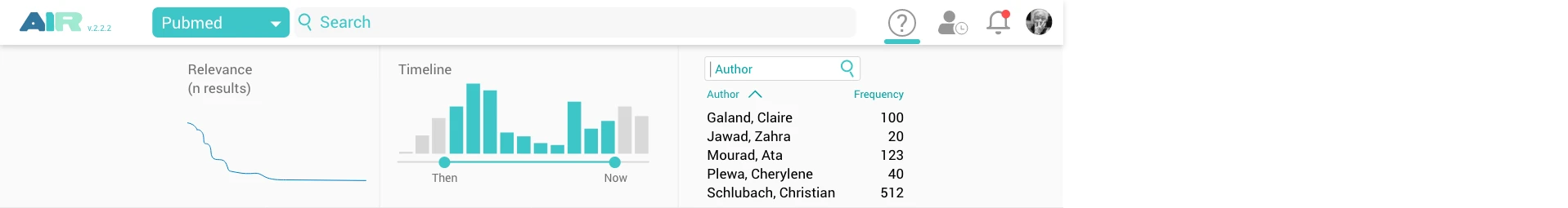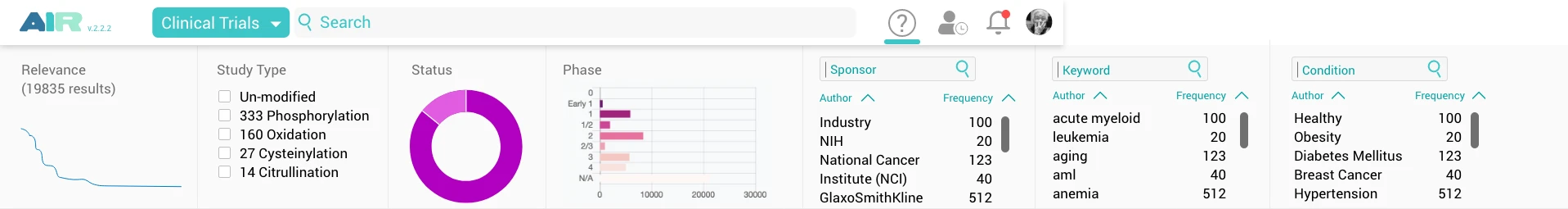 AIR is a desktop, internal search-engine web-app for the scientific community at Agenus to aggregate, share, and peer-validate content, maximizing knowledge-sharing and minimizing silos of unexploited information; a great tool for R&D. AIR maximazes resources by identifying all content redundancies in the company's servers, removing duplicates, and making information available to all users through the instantiation of unique items.