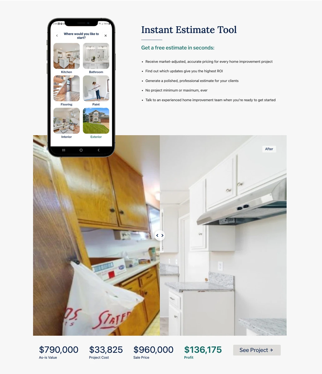 Photography of tasteful living spaces has great appeal. The value proposition was to 1.) Switch emphasis on the homepage from the transaction between agents & homeowners to showing the quality and impact of Curbio’s renovation results. 2.) Give more prominence to ROI for homeowners, realtors, and agents after Curbio’s intervention.