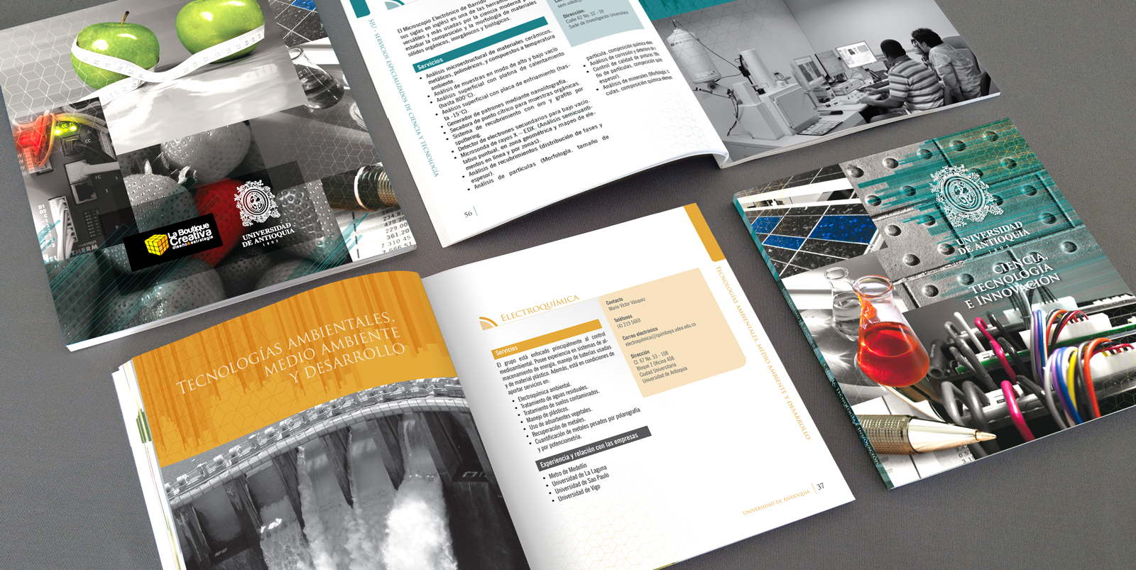 With a full color cover and a two ink interior, the porfolio promoted technological services from the Antioquia University with vibrancy and within production budget. Two ink printing plates were made per page, but a combination of black and one other ink were used from section to section to eliminate the sensation of a two color limitant while keeping production costs low.